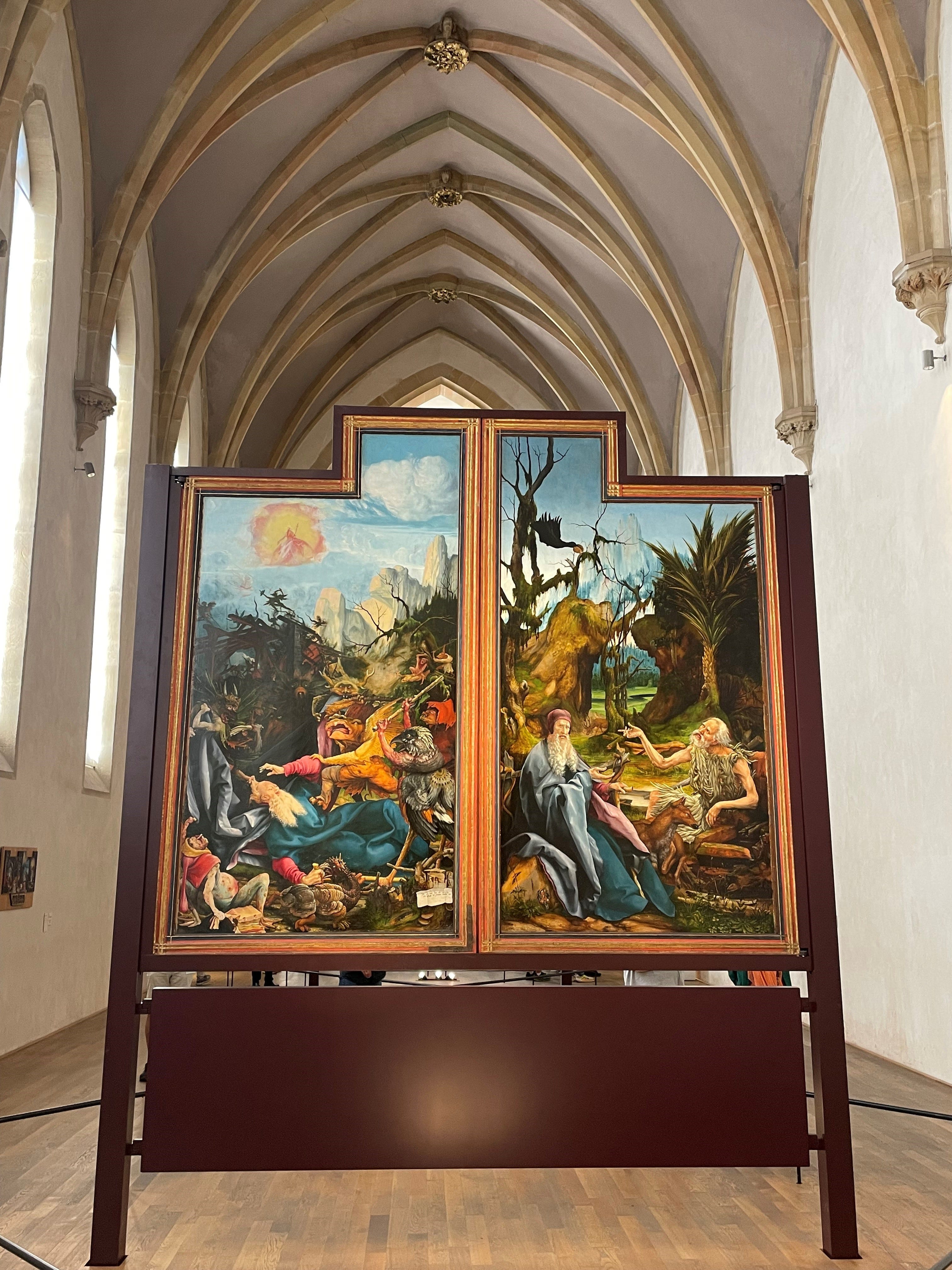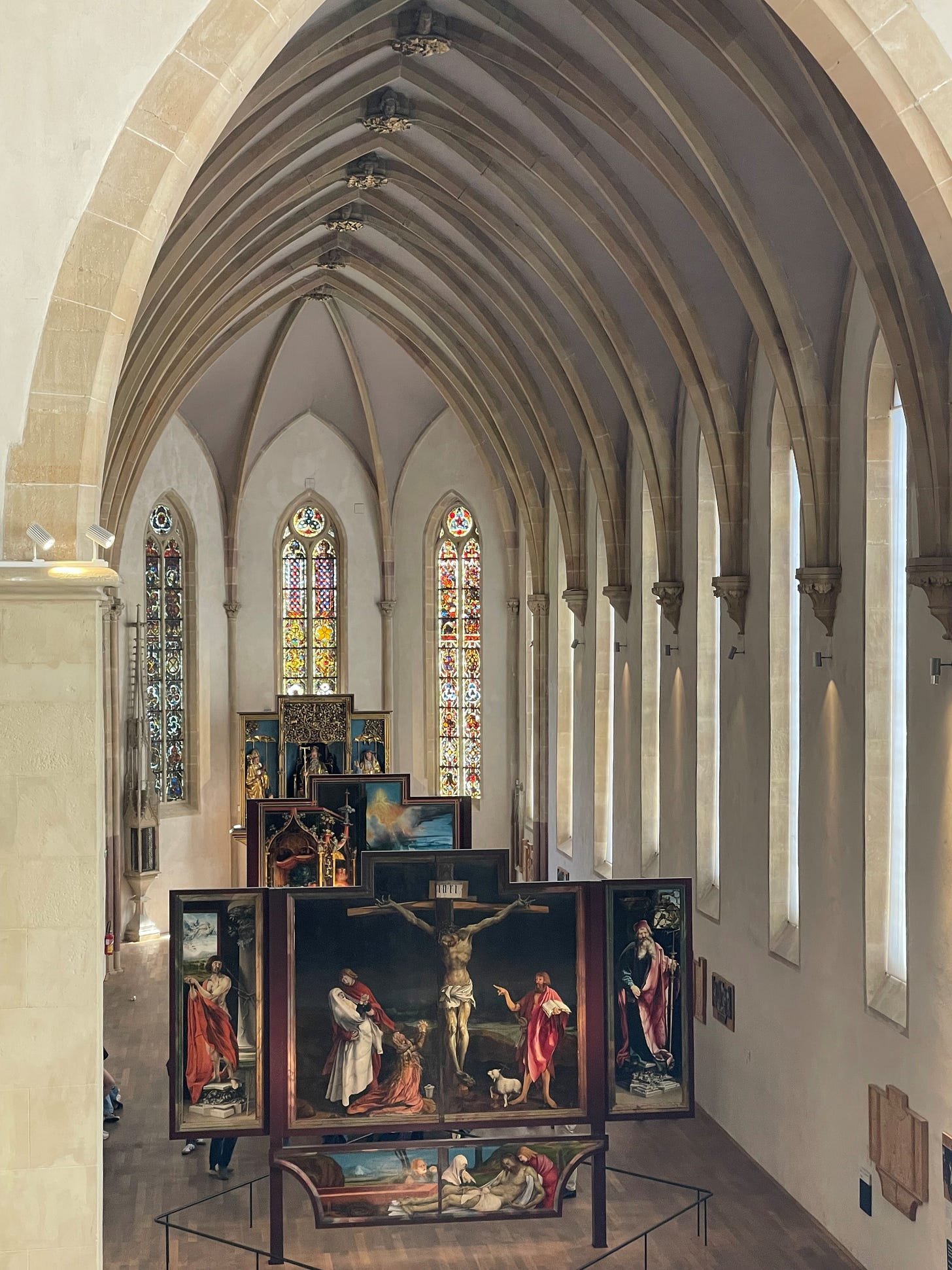 Somewhile later, we pile into a rental car with a huge screen that doesn’t work because we didn’t buy that package and roll towards Colmar, sandwiches packed in our totes (chorizo, comté, quickled shallot on slices of a crumbly dense loaf and a dessert pb & j). The Musée Unterlinden is a revelation. A 13th-century Dominican sisters’ convent houses the museum (it was also, importantly, a public baths building in the early 20th-century).
