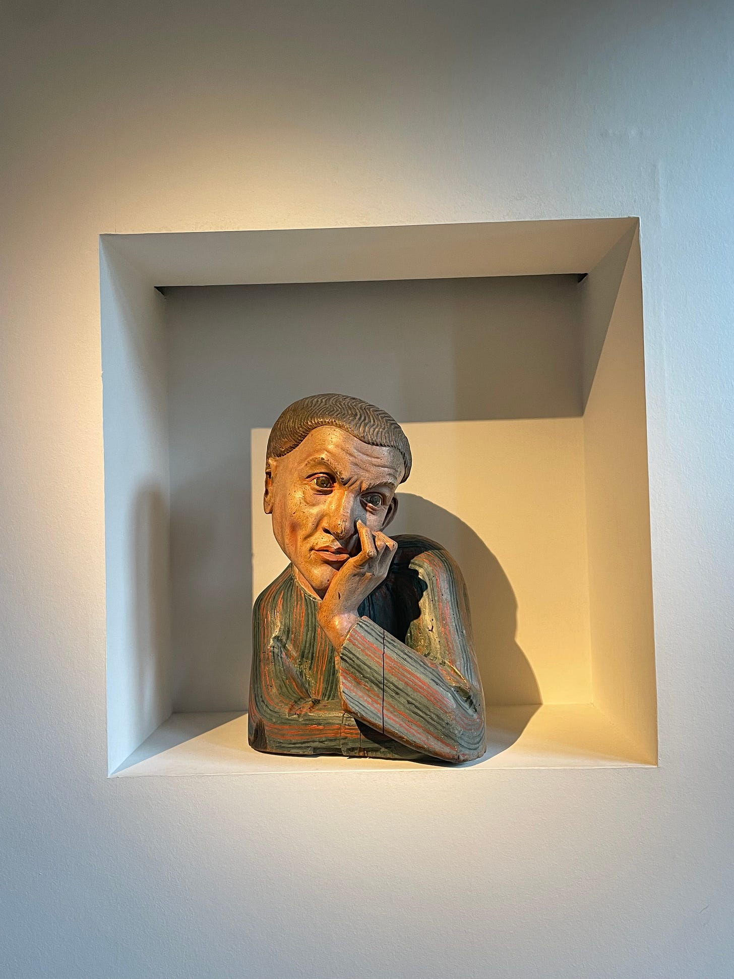 Outside the rain falls, inside, I lean in on a wooden bust, Buste d’homme accoudé, tucked away in a niche on one wall. He rests his chin on a propped hand, brow furrowed in interest or emptiness, striped shirt one I’d like to wear myself. Opposite, Conrad Witz’s St Mary Magdalene and St Catherine hangs in crisp, generous, sumptuous clarity.